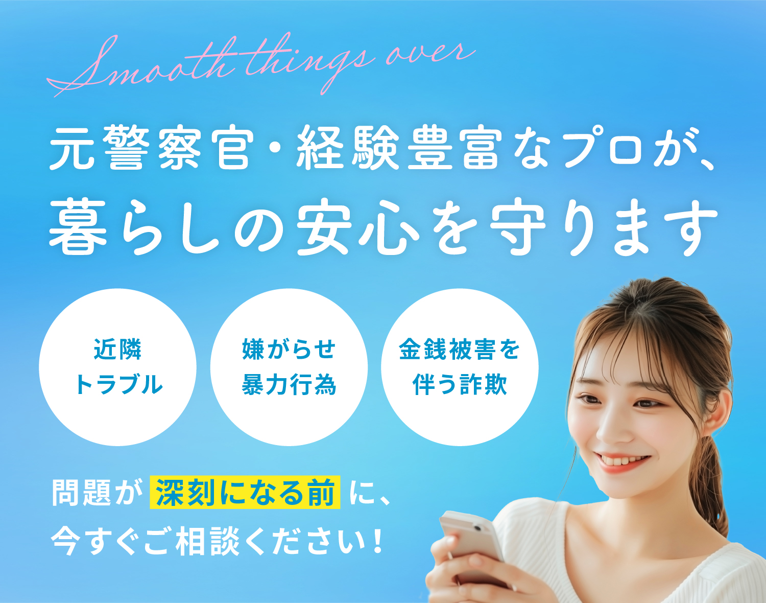 近隣トラブルの対応に慣れていない方にとって、誰に相談すればいいのかわからないことも多いはず。当サービスでは、元警察官や法律の専門家が対応し、具体的なアドバイスや解決方法を提案します。専門知識を持つプロが寄り添い、最善の解決策を見つけます